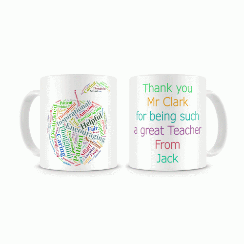 Personalised mug showing all the wonderful description words for your teacher on the front, and on the back is a thank you message from your child to his or her teacher.